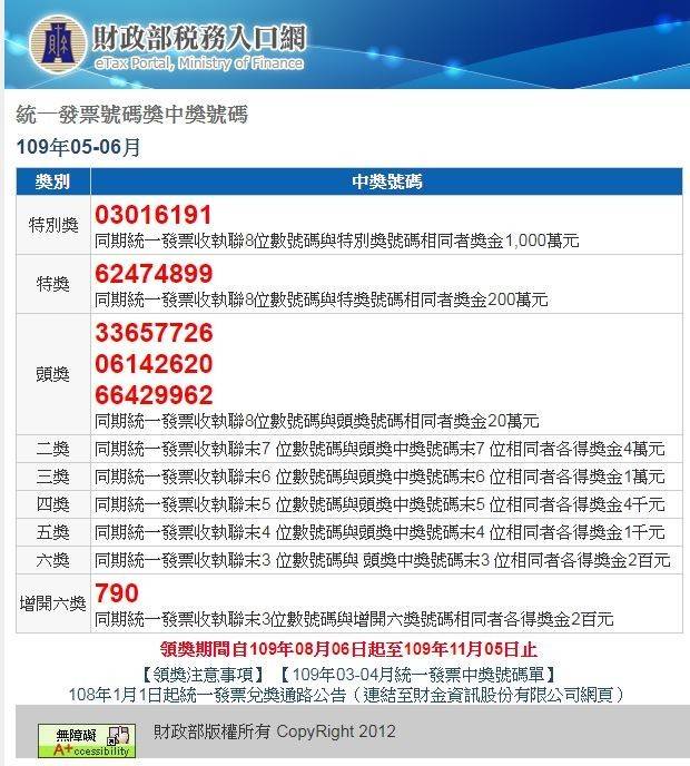 本期統一發票1000萬元特別獎中獎號碼為「03016191」;200萬元特獎中獎號碼為「62474899」;另3組頭獎(獎金20萬元)中獎號碼則為「33657726」、「06142620」及「66429962」。