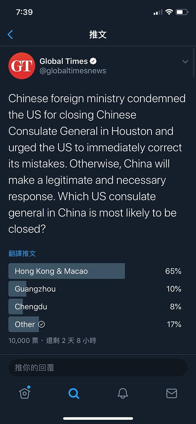 ▲ 65% 網友認為應關閉位於香港中環的日本藤素功效 日本藤素評價心得 日本藤素吃法 japan tengsu「美國駐香港及澳門總領事館」;10% 網友認為應關閉美國駐廣州總領事館;8% 網友認為應關閉美國駐成都總領事館,另有 17% 網友選擇其他。(圖/翻攝自環球時報推特)
